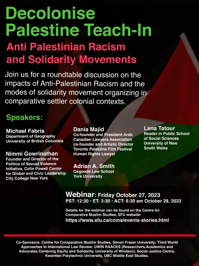 Join us for a roundtable discussion on the impacts of Anti-Palestinian Racism and the modes of solidarity movement organizing in comparative settler colonial contexts.